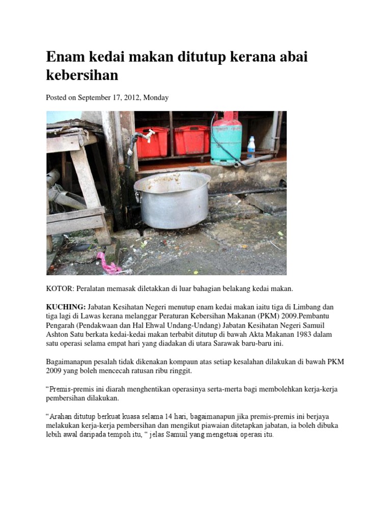 Enam Kedai Makan Ditutup Kerana Abai Kebersihan