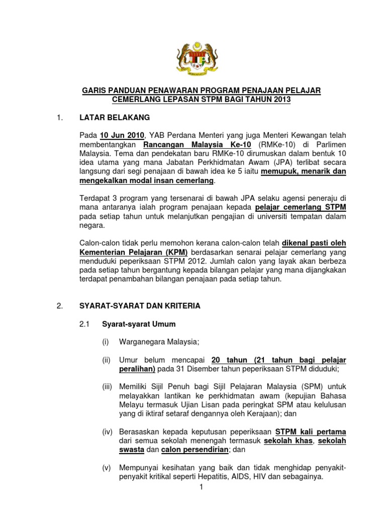 Syarat Permohonan Program Pelajar Cemerlang Stpm 2013